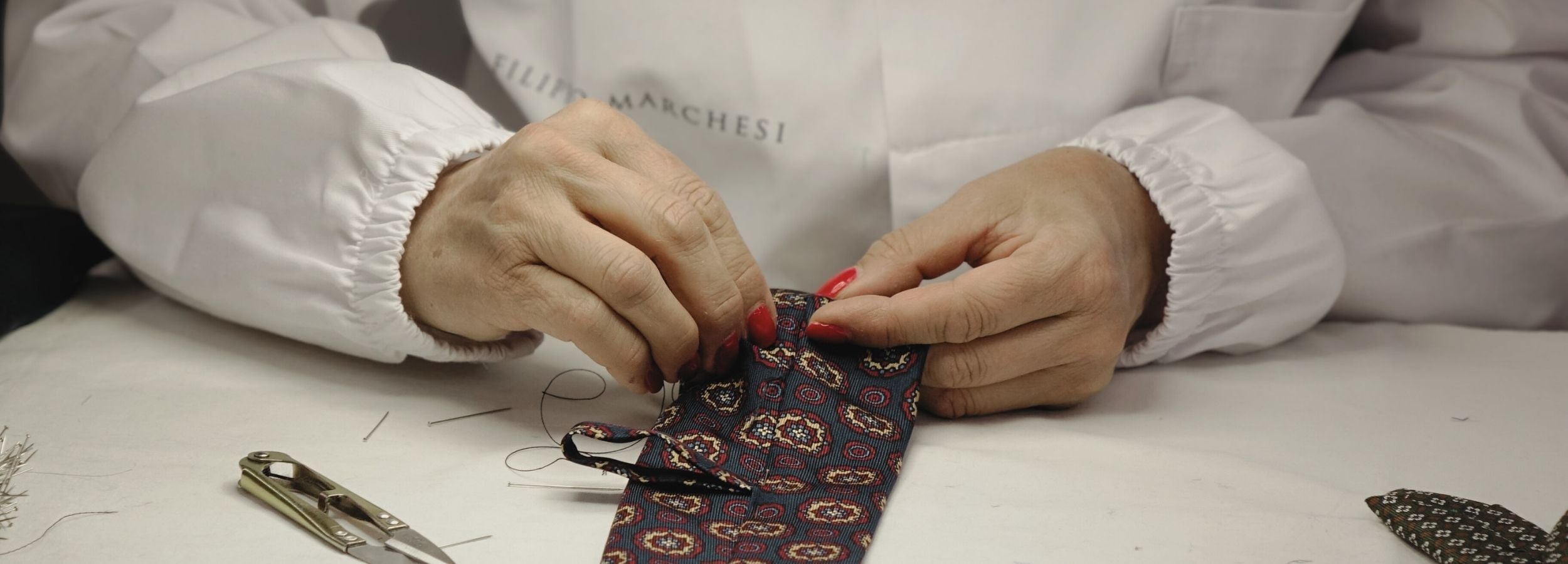 L’arte sartoriale italiana è il cuore di ogni creazione Filippo Marchesi. Le nostre cravatte, pochette, camicie, le nostre creazioni nascono dalle mani esperte di maestri artigiani che custodiscono tecniche tramandate da generazioni, unite a una ricerca costante della perfezione.